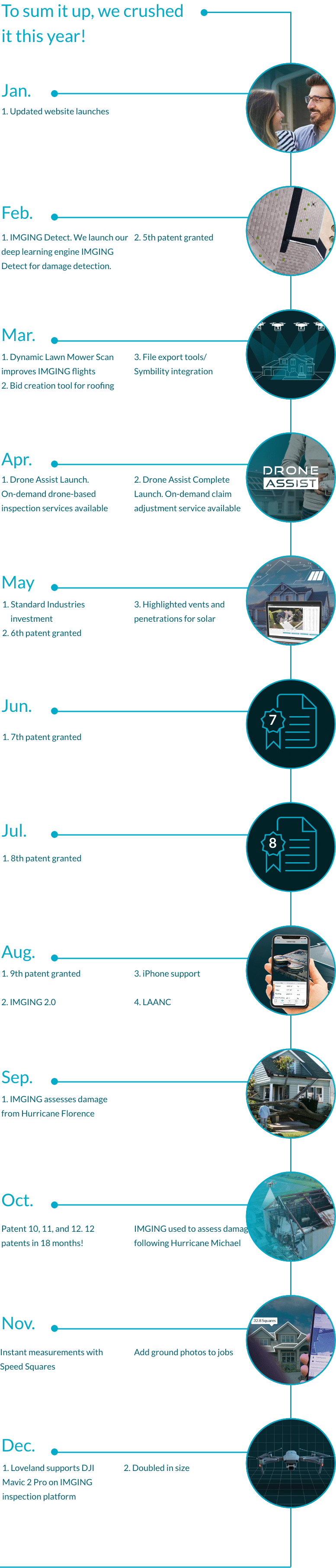 We made a huge impact for insurance, roofing, and solar in 2018. On the insurance side, we launched Drone Assist, which provides carriers with completely new ways to close claims and improve cycle times—we even locked down relationships with some of the biggest carriers in the country (look for more details in 2019). For roofing, we solidified a partnership with Standard Industries (GAF), one of the largest roofing and waterproofing manufacturers in the world. For solar, we’ve forged relationships with some of the biggest providers out there to improve their survey speeds and surveyor safety. On the app side, we launched a deep learning engine for damage detection, and racked up 12 total patents in the last 18 months. We’re using these patents to fuel awesome features that make our IMGING inspection platform even better.