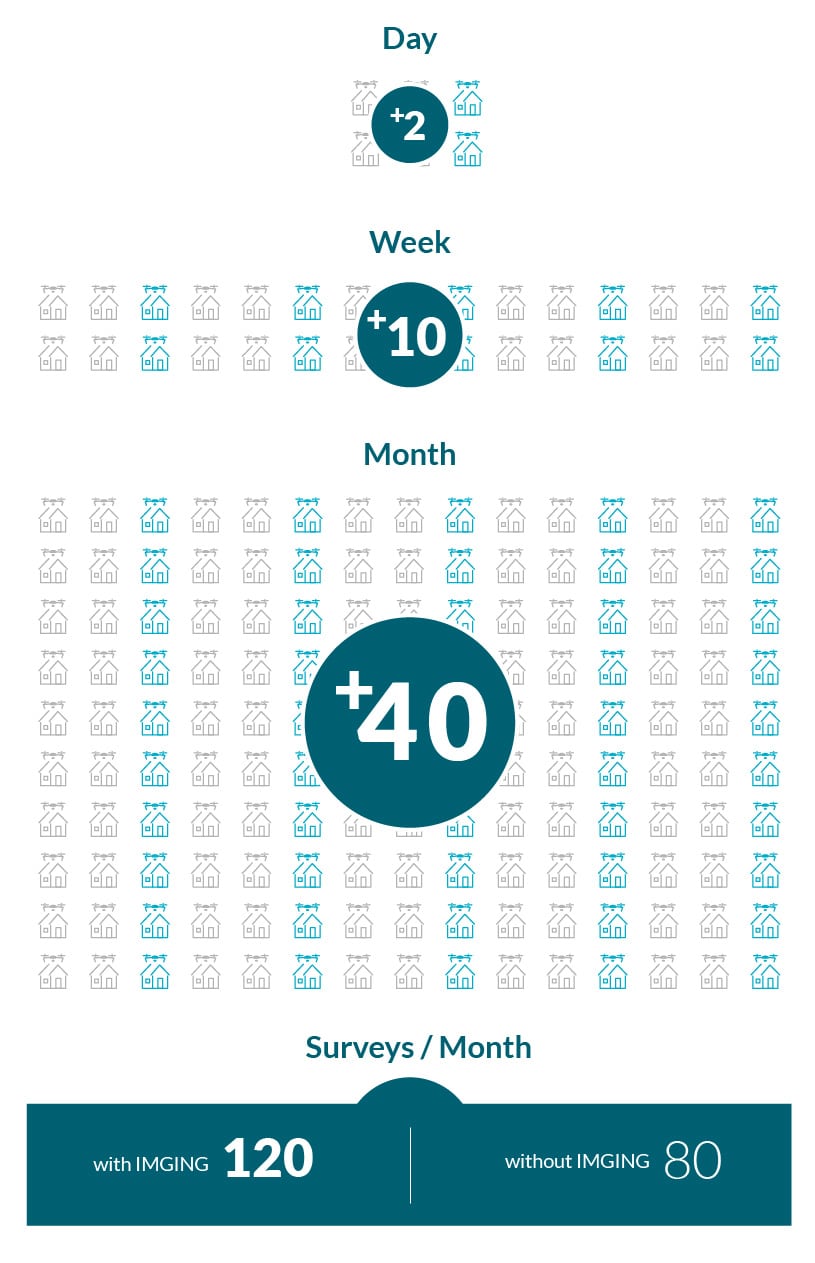 Let’s say your average site surveyor completes four surveys a day, or roughly 80 surveys per month. By using IMGING, our customers are easily adding at least two additional site surveys per day per surveyor, meaning your team has the potential to bump that number up to 120 surveys a month. Darryl Harrison, Engineering Manager for Baker Electric Home Energy stated “We’ve transitioned to using the drone and have seen our survey time drop from 2 hours to 45 minutes to an hour on site.”