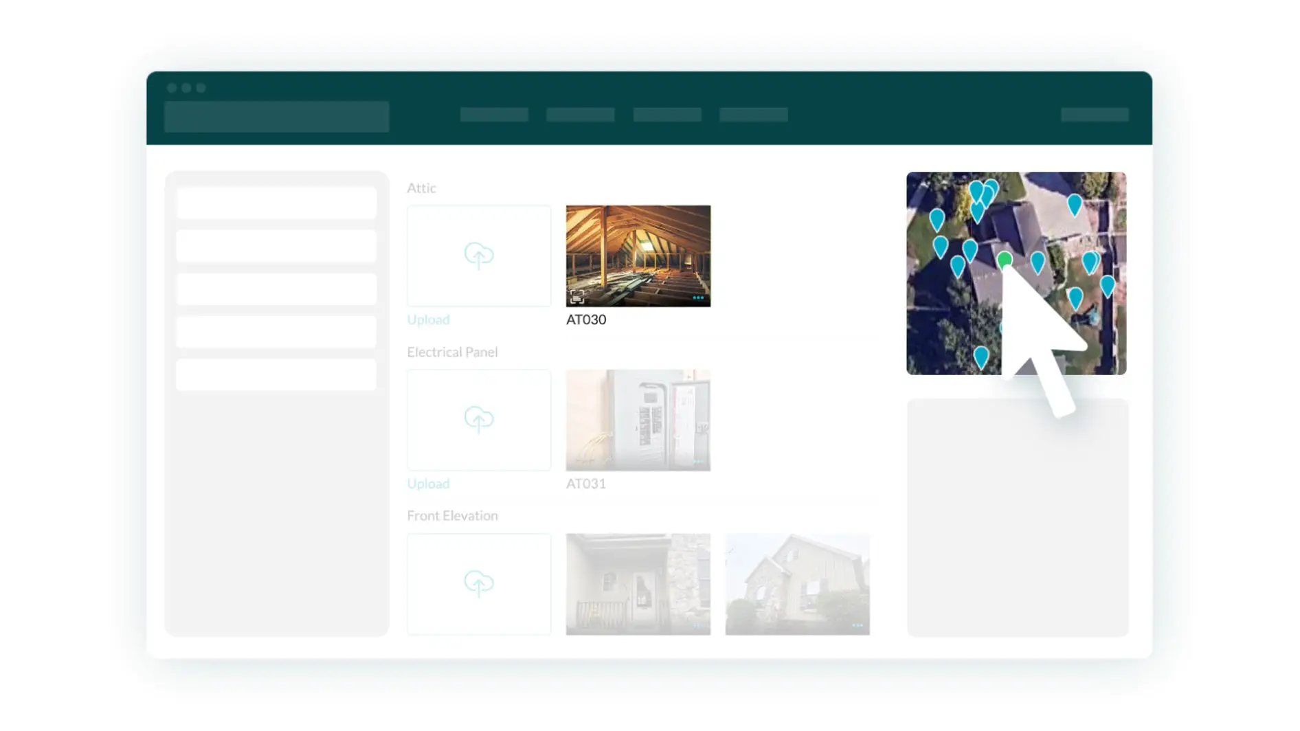A desktop software user-interface with a mouse cursor hovering over an aerial view of a home that has location pins. The cursor has clicked on a pin that then highlights the photo in a gallery to the left showing how you can easily find photos.