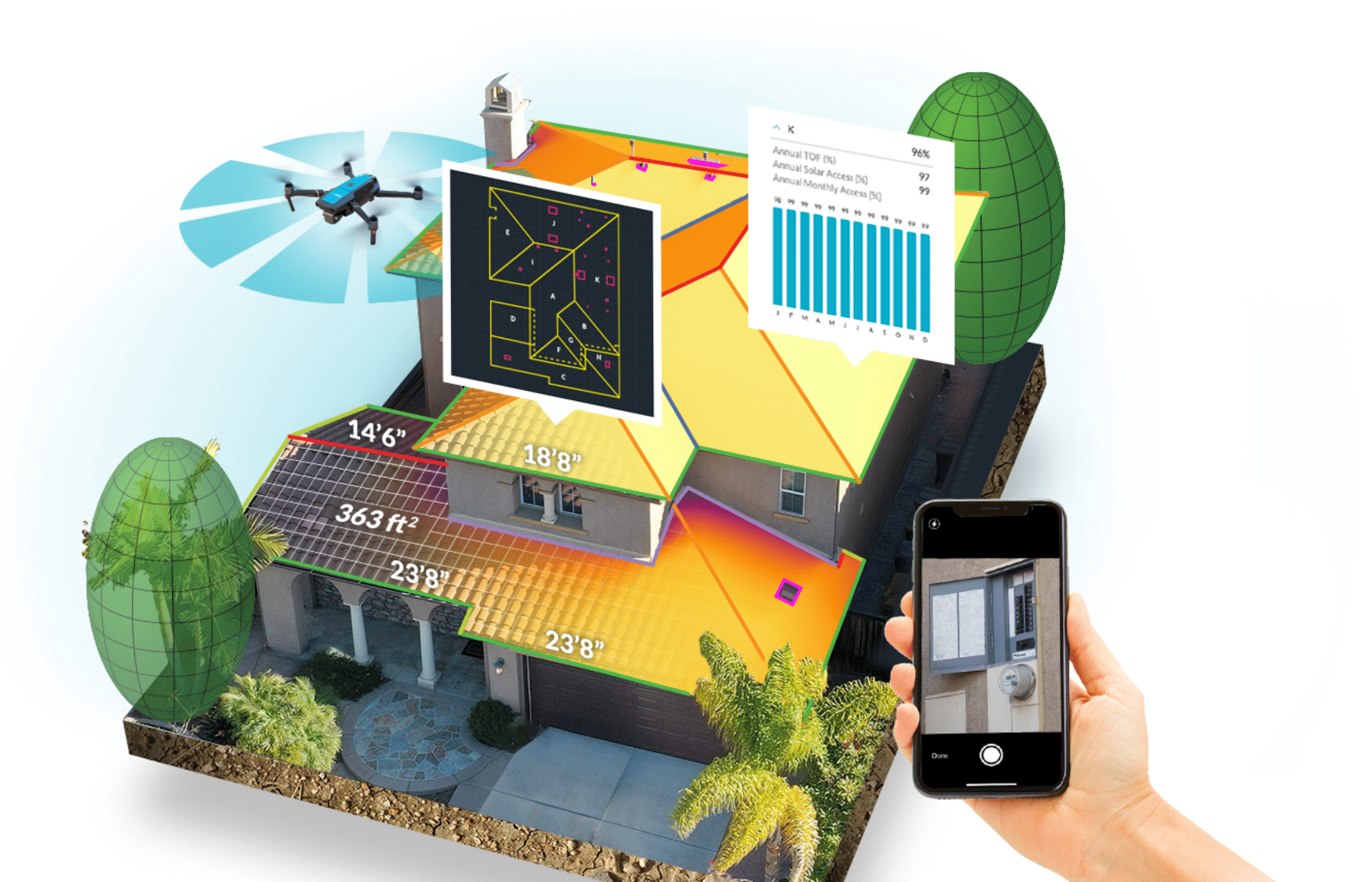 With IMGING, solar pros need never redesign or add a truck roll again. Precise measurements – more accurate from a satellite or plane – provide real-time data on every aspect of the roof. When they’re done, system designers have half their work already finished.