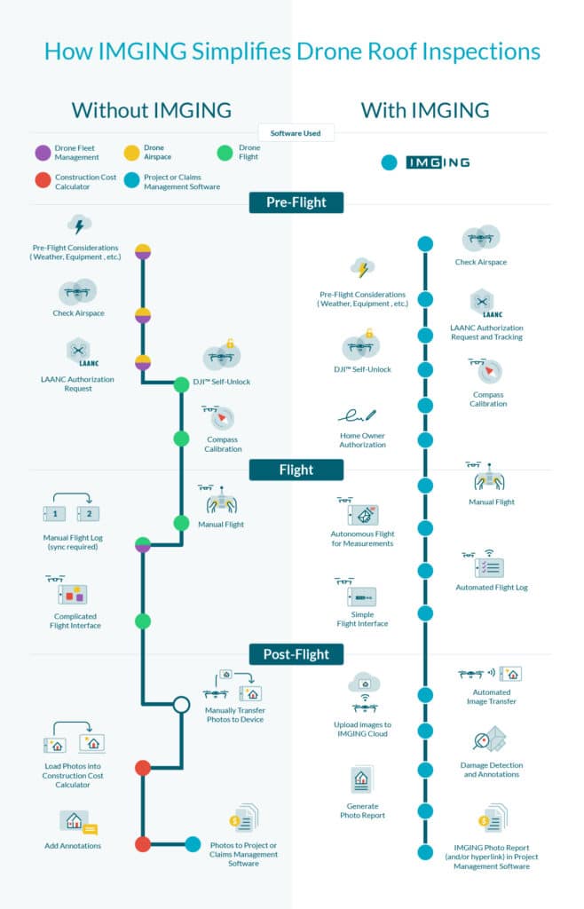 When discussing IMGING as a platform, it’s often in relation to cloud collaboration, APIs, integrations, and other features. But it’s also important to understand how many drone, airspace, flight, measurement, project management, claims, and other apps are required to duplicate what happens in IMGING for a user on the ground. This infographic shows how IMGING collapses five apps into one.